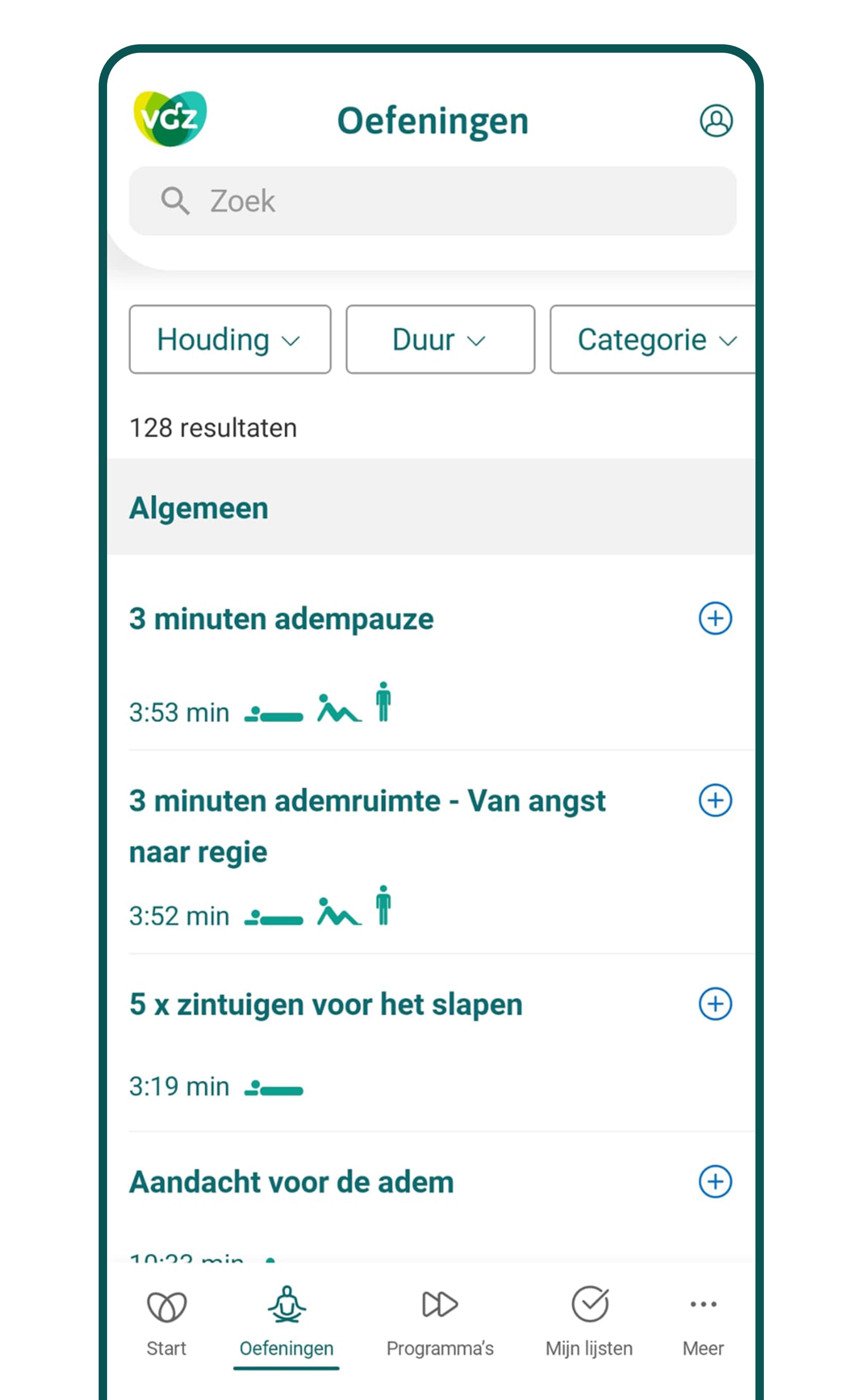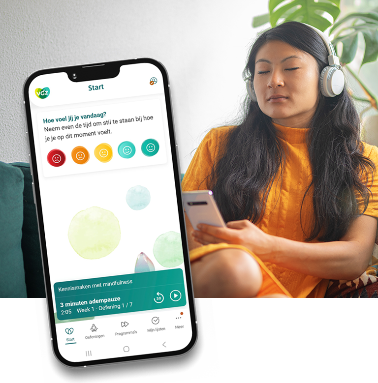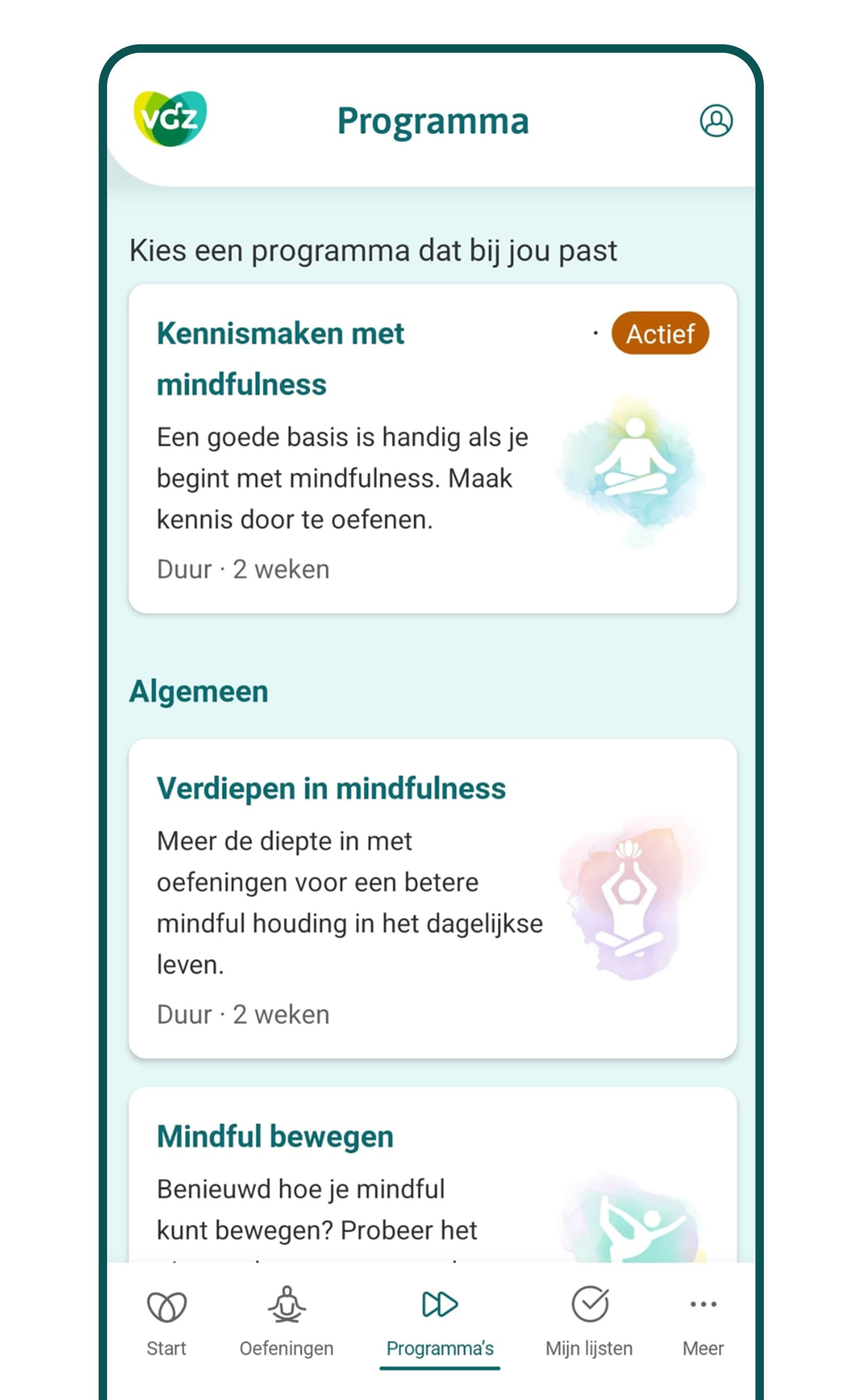 Als je lichte psychische klachten of burn-outklachten ervaart, is het belangrijk om actie te ondernemen. Naast de gratis VGZ Mindfulness Coach app kunnen wij meer voor je betekenen. Vanuit de meeste aanvullende pakketten is er een vergoeding voor mindfulness-trainingen. Vanuit je aanvullende verzekering kan je tot 350 euro vergoed krijgen. Meer weten?