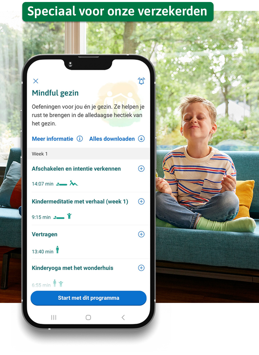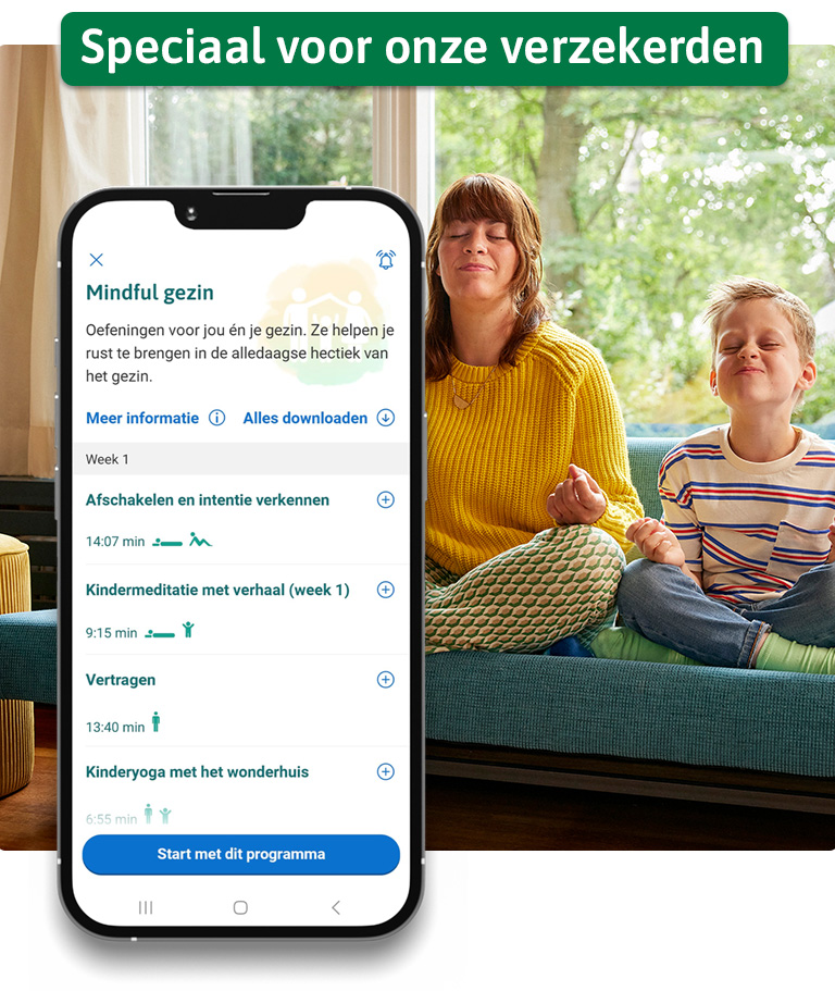 'Mindful gezin' is speciaal gemaakt voor onze verzekerden. Heb jij een verzekering bij VGZ, VGZBewuzt, IZA, IZZ Zorgverzekering, UMC Zorgverzekering of Zorgzaam? Dan heb je exclusief toegang tot dit programma.