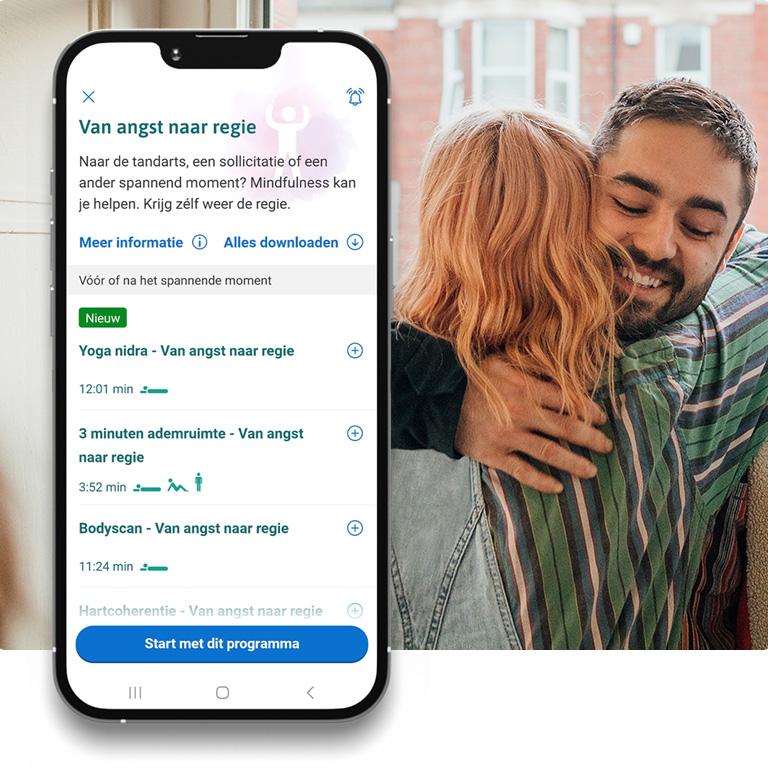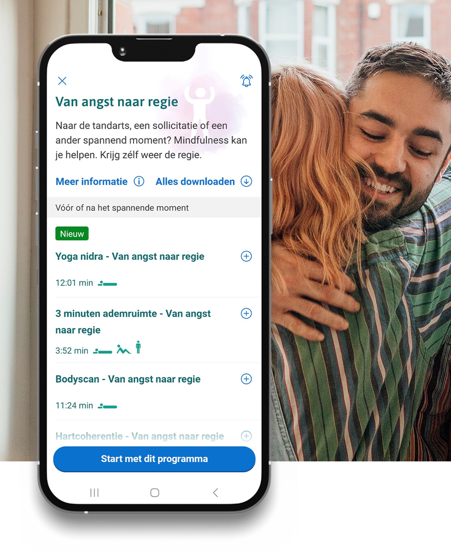 Naar de tandarts, een vliegreis of sollicitatie. Veel mensen voelen angst bij zulke gebeurtenissen. Maar vaak kun je leren om te gaan met deze gevoelens. Mindfulness kan helpen spanning te verminderen. Daar helpt het programma 'Van angst naar regie' in de gratis VGZ Mindfulness Coach app jou mee. Het programma is gemaakt door mindfulness-trainer Annegreetje Wolfs.