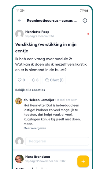 Via de website reanimatiecursus.com kun je contact opnemen. Dat gaat via het contactformulier. Je kunt tijdens jouw cursus ook vragen stellen via de Reanimatie Community.