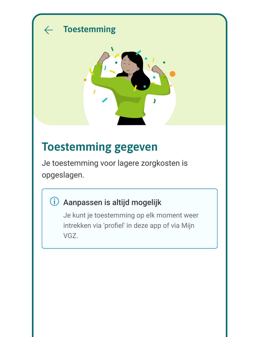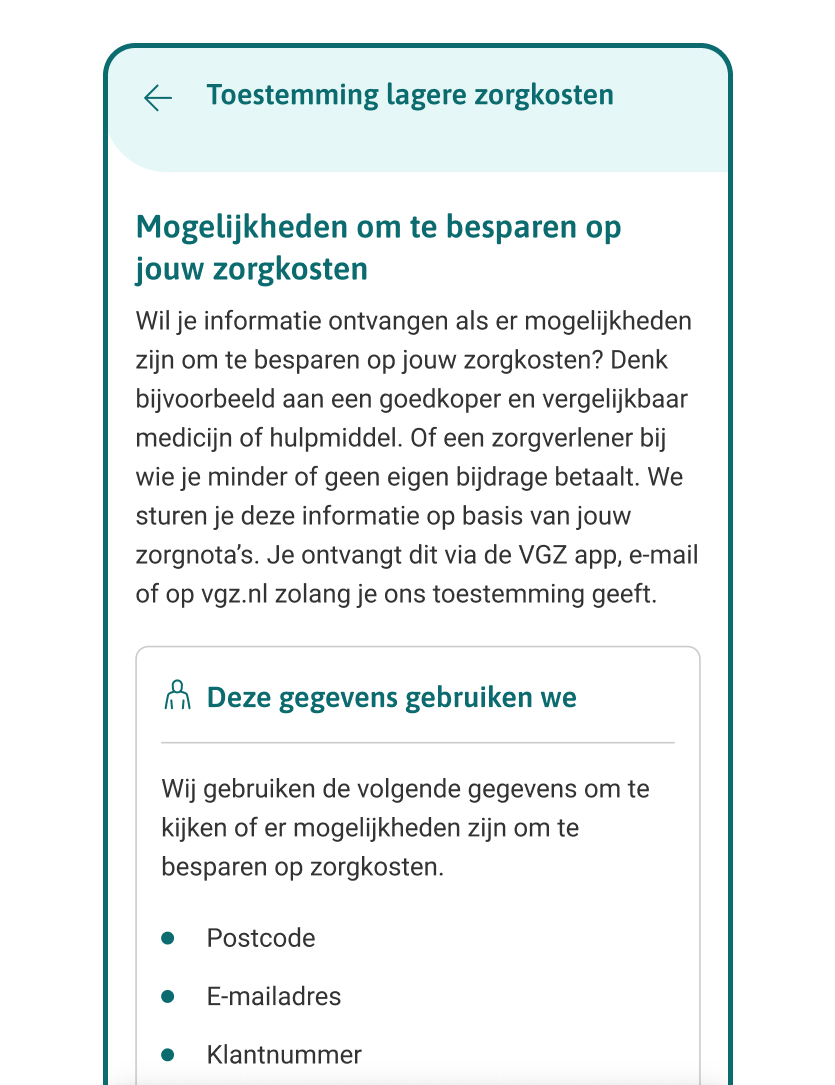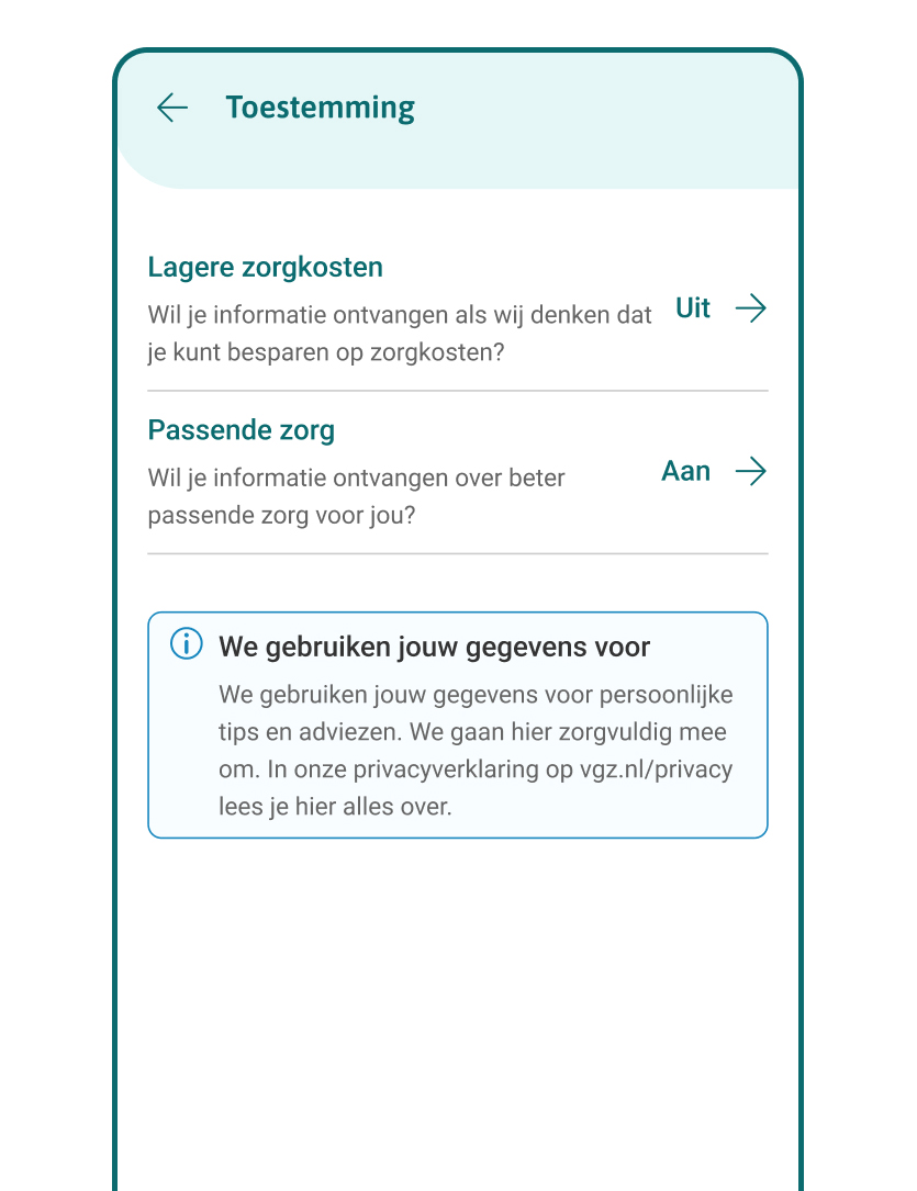 Zo kunnen we jouw nog beter helpen. Stel je voor: je bent in behandeling in het ziekenhuis. En je kunt van VGZ informatie ontvangen over hoe je op jouw zorgkosten kunt besparen. Of nuttig advies waardoor je misschien wel vanuit huis geholpen kunt worden. Dat kunnen we voor je regelen. Hiervoor hebben we jouw toestemming nodig. Zodat we jouw gegevens mogen gebruiken. Je toestemming geef je eenvoudig in de VGZ app.