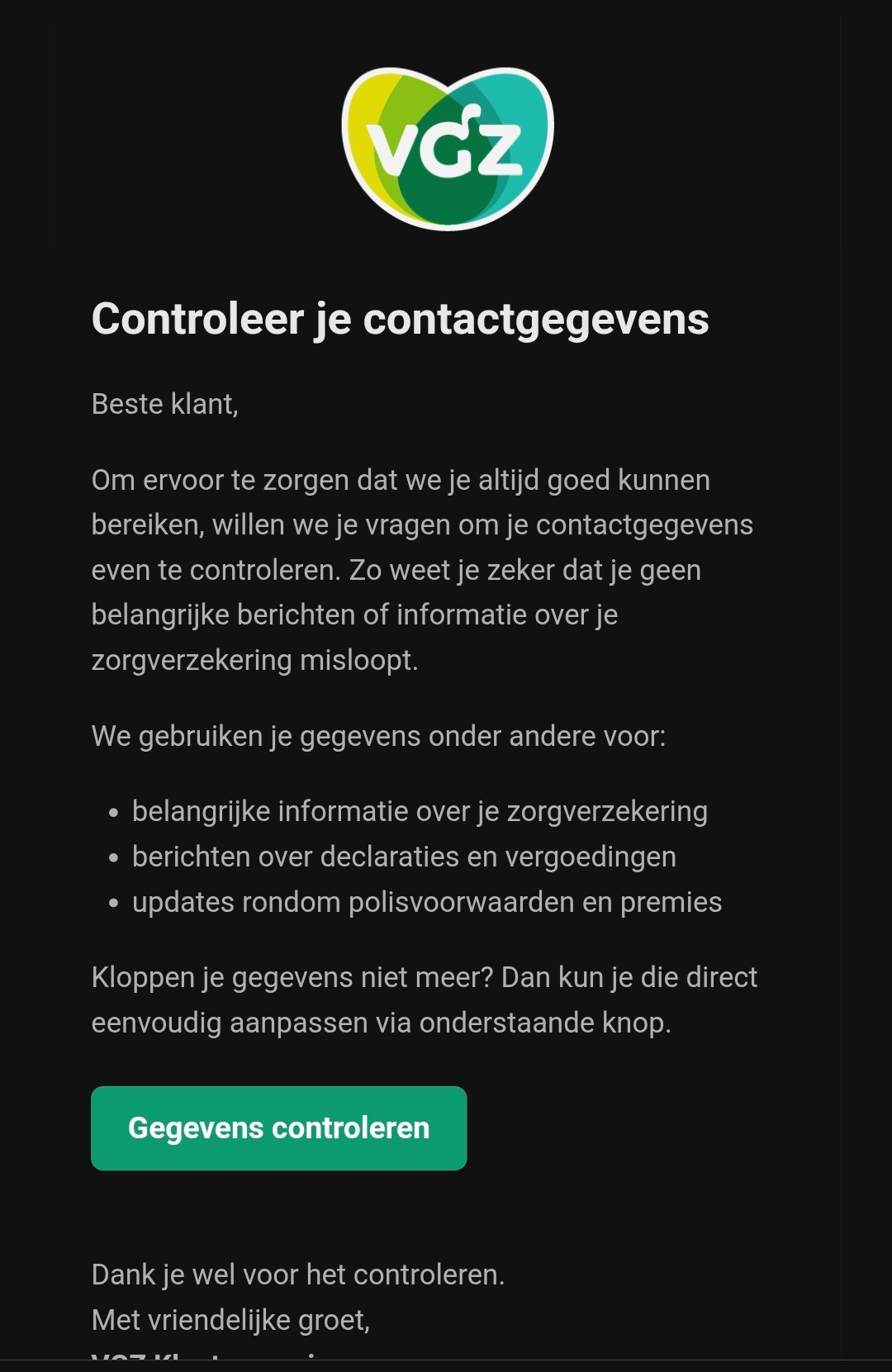 In de mail wordt gevraagd of je je contactgegevens wilt controleren. Ook staat er in de mail een knop met 'gegevens controleren'. Klik hier niet op. Meld de mail bij onze klantenservice.