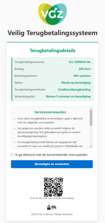 In de mail staat dat je een terugbetaling van ons krijgt. Je wordt gevraagd om de terugbetaling te bevestigen via je creditcard. Doe dit niet. Meld de mail direct bij onze klantenservice. Klik niet op links. De mail lijkt afkomstig van VGZ, maar is dat niet.